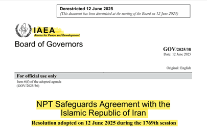 En base a ese informe de Grossi, el 12 de junio, en vísperas del ataque preventivo por sorpresa israelí, la Junta de Gobernadores de la AIEA emitió la resolución GOV/2025/38 (AIEA vs Irán), con título “Aplicación del Acuerdo de Salvaguardias del TNP en la República Islámica de Irán”, expresando en sus considerandos previos: