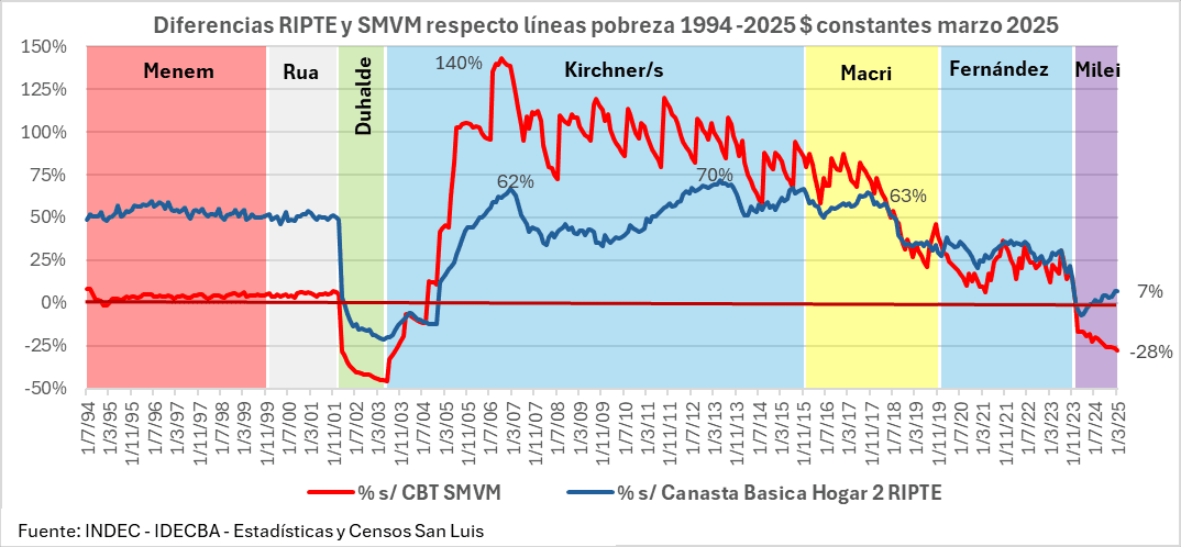 En el siguiente gráfico, en el que se ha rebatido al RIPTE y el SMVM en relación con sus líneas de pobreza, Canasta hogar Tipo 2, CBT respectivamente, se hace una síntesis de esta cuestión. Observándose que durante la convertibilidad en el marco de un alto desempleo, el RIPTE (línea azul) según el INDEC, se encontraba un 50 % por arriba del monto de la Canasta Hogar Tipo 2. Cifra que habría que tomar con cautela, porque a lo largo de ella su publicación era dos meses al año, en abril y septiembre, y en 1999 hubo un cambio en la base de su cálculo por el INDEC