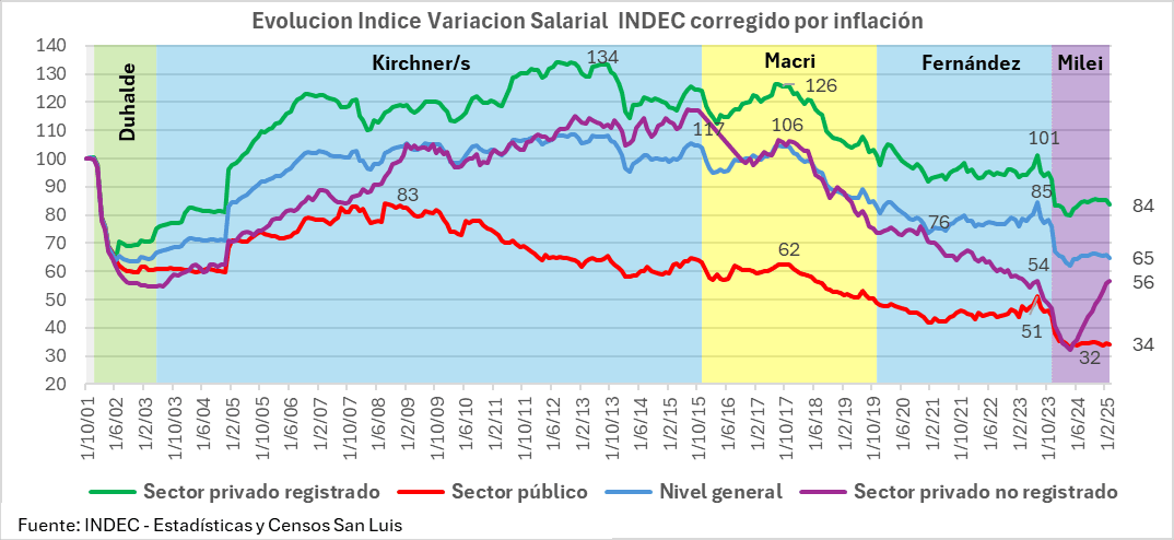 Se puede apreciar en él, que a partir de un índice 100 en octubre del 2001, con la caída de la convertibilidad el salario en el Sector privado registrado (trazo verde) cayó hacia fines del gobierno de Duhalde menos -30 %, luego con los Kirchner/s llegó a un pico de 134, con Macri 126; con Fernández en su final 100, igual al de la convertibilidad, y con Milei menos 84. Lo cual representa una caída de menos -38 % respecto el pico Kirchner/s, de menos -33 % o sea un tercio menos del pico Macri, y menos -16 % del pico Fernández.