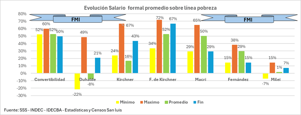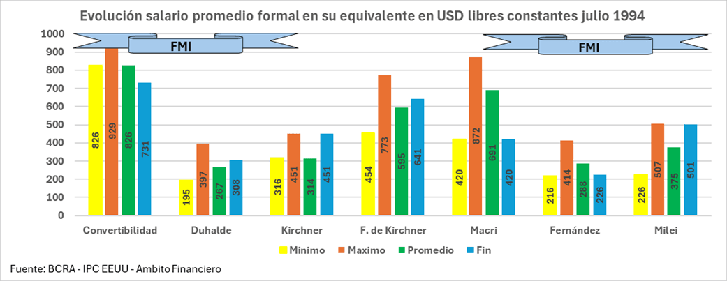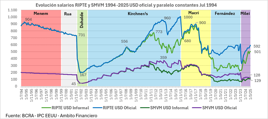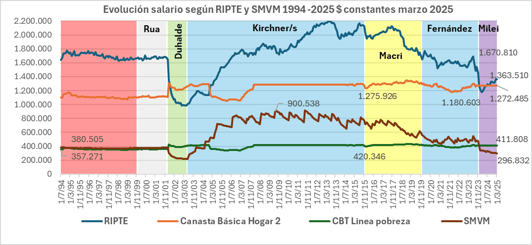 En el RIPTE (Remuneración Imponible Promedio de los Trabajadores Estables) brinda una idea de cómo evolucionó el salario promedio de los trabajadores formalizados. Pudiéndose observar que su parámetro principal, el Promedio de cada gobierno, como se puede apreciar seguidamente, pasó en millones de $ 1,69 en la convertibilidad, a $ 1,14 con Duhalde, a 1,64 con Kirchner, a $ 1,96 con Fernández de Kirchner, y a $ 1,95 con Macri. Derrumbándose a partir de allí con la reaparición del FMI en el 2018, a $ 1,61 con Fernández, y $ 1,28 con Milei, volviendo así este casi al nivel de Duhalde.