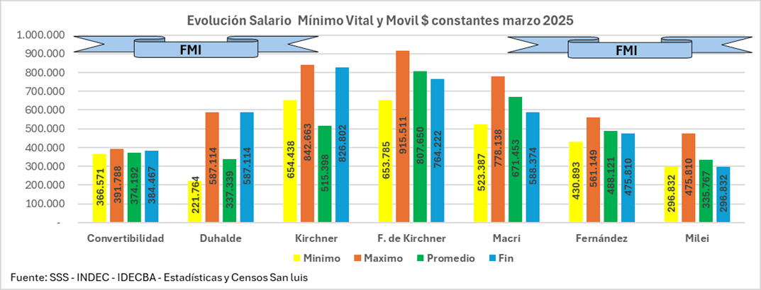 Respecto el Salario Mínimo Vital y Móvil (SMVM) que fija un piso legal, su indicador principal el Promedio a $ constantes marzo 2025, como se puede apreciar seguidamente, fue de $ 374 mil durante la convertibilidad, $ 337 mil con Duhalde, $ 515 mil con Kirchner, $ 807 mil con Fernández de Kirchner, $ 671 mil con Macri, $ 488 mil con Fernández, y $ 335 mil con Milei, al mismo nivel que durante Duhalde.