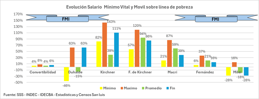 Con la irrupción del FMI en el 2018, dicho nivel se desplomó hasta un 25 %. Y con Fernández y la pandemia, siguió cayendo hasta casi tocar la línea de pobreza para luego oscilar alrededor de un 25 % sobre ella. Finalmente con Milei el SMVM cayó por debajo de la línea de pobreza, llegando a estar en marzo pasado menos – 28 % debajo de ella. Hundiendo así a quienes perciben el SMVM en la pobreza estructural.