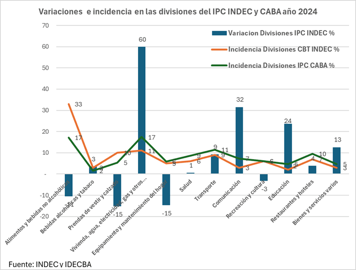 En el mismo resultan notables dos aspectos. Uno, los enormes aumentos sobre el Nivel general que registran las divisiones o ítems Vivienda, Comunicación, Educación, Bienes y servicios. Los que paralelamente tienen una baja incidencia porcentual en el cálculo, si se los compara con el IPC de la CABA. Y por otro lado la alta incidencia que tienen en el cálculo las divisiones que disminuyeron su aumento en relación con el Nivel General del INDEC, como Alimentos, Prendas de vestir, Equipamiento, Recreación y cultura, etc.