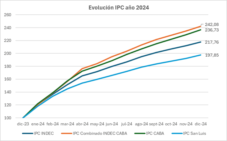 Por esa razón, se efectuó un recalculo de los valores del IPC INDEC, tomando para ello las incidencias de las distintas divisiones provenientes del IPC CABA. Arrojando esto para el crucial año 2024, una variación del 142 % de este índice combinado, en contraste con el 136 % del IPC CABA , y del 117 % del IPC INDEC. Tal como se puede apreciar en el siguiente gráfico comparativo, en el que también se introdujo el IPC de la provincia de San Luis, que arrojó un valor de 197 %.