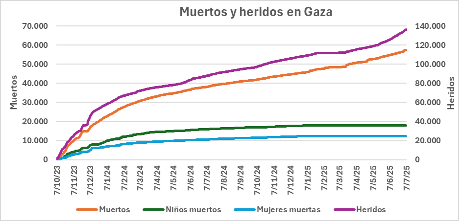 El ministerio de Salud de Gaza informa que hasta hoy se han producido 57.418 muertes provenientes de ataques israelíes. De los cuales 18.000 fueron niños y niñas, y 12.400 mujeres. Con un adicional de 132.261 heridos.