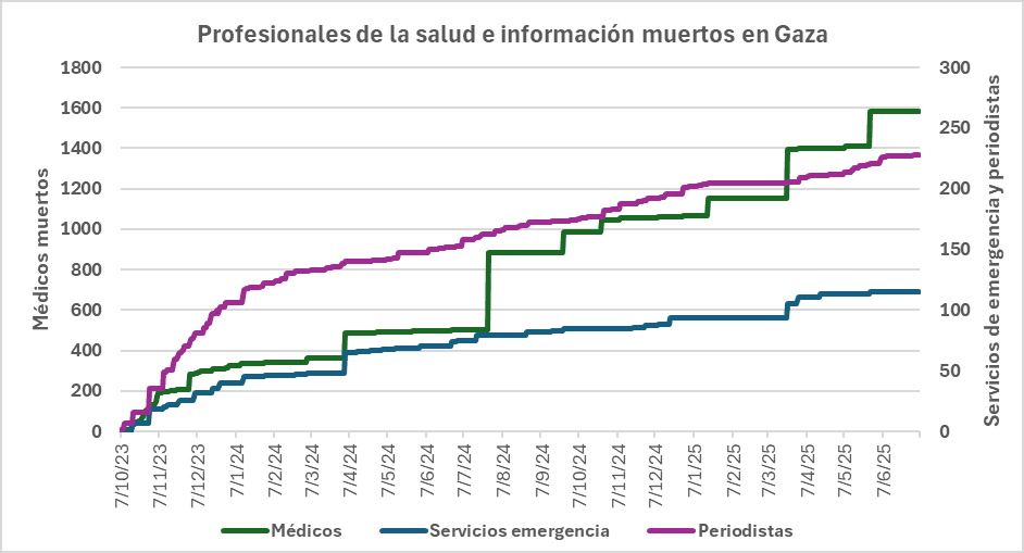En cuanto a profesionales relacionadas con la salud, el ministerio informa que han muerto 1.584 médicos y medicas en los ataques israelíes perpetrados contra hospitales. Y 115 socorristas de servicios de Emergencia, no obstante estar protegidos por la luna roja. Y en cuanto a periodistas, que es otra actividad que incide en el conflicto, da cuenta que fueron 228.