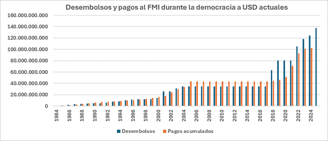 Que ha hecho qué a lo largo de ella, nuestro país recibiera préstamos del FMI por un total hasta hoy de USD 137.284 millones al tipo de cambio actual de USD 1,42 por DEG, Derechos Especiales de Giro, la “moneda” del FMI. Y que le hayamos efectuado pagos por USD 102.277 millones, quedando no obstante una deuda remanente de USD 55.577 millones, por efecto de los cargos e intereses pagados por USD 20.570 millones.