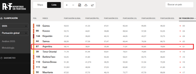 El Informe 2024 de la organización, publicado a sólo cinco meses de la asunción del Gobierno, revelaba que el ascenso de Milei al poder marcaba “un nuevo y preocupante punto de inflexión para la garantía del derecho a la información en el país”. Mientras que un año más tarde “la situación se profundizó, en un contexto de deriva autoritaria”; desplomándose Argentina en 21 posiciones, “cayó 47 puestos en dos años”. En 2023, último año de gobierno peronista, Argentina se encontraba en el puesto 66, y en 2022, estuvo en el puesto 40.