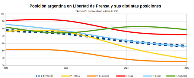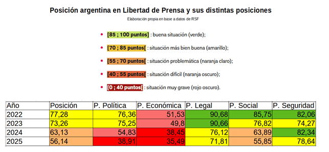 Con esos colores en la imagen superior se pintan los puntajes obtenidos por Argentina desde 2022 a 2025. Como se puede ver, la posición de la izquierda, el Promedio general, tiende a la baja, entrando en un panorama problemático. Y en cuanto las cuestiones más específicas, se observa un fuerte deterioro en las puntuaciones referidas a la Política y la Economía, en contraste con la cuestión Legal y de Seguridad, que también van perdiendo su panorama de brindar libertad a la prensa. Lo mismo ocurre con lo Social.
