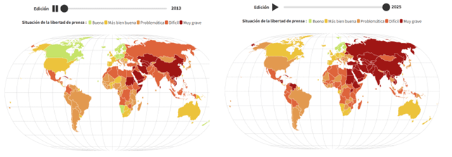 Los siguientes planisferios, hechos por RSF, comparan el panorama en base a los resultados publicados en 2013 y 2025. Como se aprecia, hay una mayor expansión del color rojo intenso, que señala un panorama “muy grave” para la prensa. Esto es acorde al surgimiento de conflictos bélicos que ocurrieron en los últimos años, como la guerra entre Rusia y Ucrania.