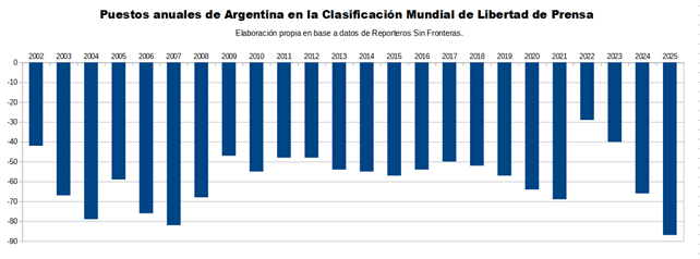 Argentina es el quinto país del mundo que tuvo el mayor pico de empeoramiento de libertad de prensa, según el reporte de RSF. Paso del puesto 66° al 87° en un año; o sea, descendiendo abruptamente 21 lugares; teniendo el desgraciado privilegio de ser una de las cinco naciones que cayeron más de 20 puestos, como si fuera un piano tirado al vacío.