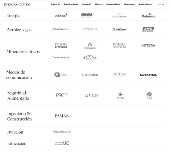 Integra Capital funciona como una firma holding que alberga las inversiones en distintos rubros, sobre todo en nuestro país, donde la cuestión de la energía y la minería son las que tienen mayor peso, además de los medios. La página web de Integra Capital muestra cabalmente el poder de Manzano.