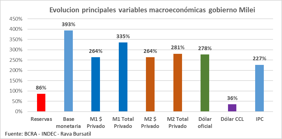 Concretamente, mal que le pese a Milei Kaput/o, ínterin, entre noviembre 2023 y agosto 2024, las Reservas pasaron de USD 21,5 a USD 39,9 millardos (miles de millones); la Base monetaria de $ 8,9 a 44,2 billones, el M1 $ Privado de 24,1 a 87,7 billones; el M1 Total Privado de $ 28,1 a 122,5 billones; el M2 $ Privado de 37,3 a 135,7 billones; el M2 Total Privado de 38,19 a 145,5 billones; el Dólar oficial de $ 316 a $ 1.361; el Dólar CCL de $ 999 a $ 1.355; y el IPC Nacional de 2.816 a 9.213.
