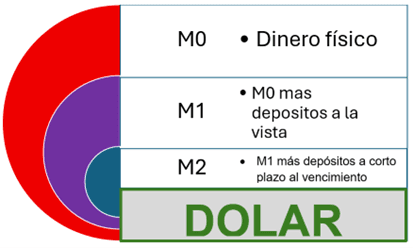 Luego viene el mencionado M2, que es el M1 más los depósitos a plazos, a corto plazo. Y finalmente el M3, es la suma del M2 más los depósitos y activos a largo plazo. Y estas sumas de EMES, principalmente M0, y M1, y también M2 al vencimiento de los depósitos a plazo, son los que pueden irrumpir en el mercado del dólar, como lo están haciendo actualmente.