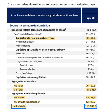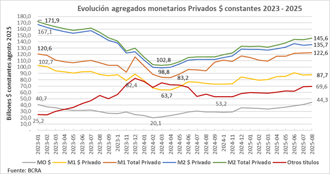 De esa manera el M1 $ Privado, que había caído de $ 102,7 billones en enero 2023, a solo $ 63,7 billones en marzo 2024, subió $ 26,3 billones, hasta los $ 90 billones, para quedar en agosto 2025, en $ 87,7 billones. Habiéndose licuado un 15 % respecto el nivel que tenía en enero 2023.