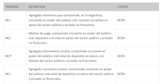 En él define al M1 como el circulante en poder del público, más solo las cuentas corrientes en pesos. Al M2 que denomina Medios de pago, lo integra con el circulante en poder del público, mas todos los depósitos a la vista, incluyendo las cajas de ahorro. Y al M3 lo integra con el circulante en poder del público, más todos los depósitos en pesos, incluyendo los a plazos. Y finalmente está el M3* que denomina Agregado bimonetario amplio, que incluye los depósitos en dólares.