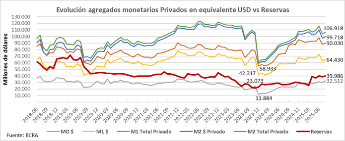 A su vez el M1 Total Privado, que incluye los depósitos privados a la vista en dólares, paso del equivalente a USD 58,9 millardos en el 2023, a USD 90 millardos en agosto 2025, con un aumento del 53 %, y un nivel similar al que había en el 2028 con Caputo en el BCRA. Siendo estos, todos los medios de pago disponibles en plaza, que fluidizan el acaparamiento de divisas con pesos.