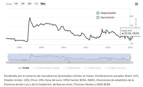 El indicador que tiene el BCRA al respecto, para medir la competitividad de la economía argentina, es el Tipo de Cambio Real Multilateral, TCRM. Cuyo índice calcula, respecto la del peso, tomando la variación de la cotización de las monedas y la inflación doméstica, de los países con los que tenemos intercambios comerciales.