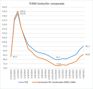 Se observa qué partiendo de un índice de 83,2 en noviembre 2023, el TCR salto a 132,8 en enero 2024, y luego cayo al mínimo de 79,7 en enero 2025. Para situarse en agosto 2025 en 95,1, en el marco de un consumo comprimido por una recesión inducida, con notables atrasos salarias y altas tasas de interés.