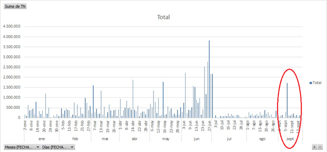Basta con revisar las DJVE presentadas a lo largo del año 2025, hasta la previa del lanzamiento del inefable decreto. Allí vemos que hubo una notoria subida que superó largamente las 1.500 toneladas en un solo día, el 8 de septiembre. Siendo esta una operación inusual al ser muy posterior a la cosecha gruesa, como dijo el entrevistado y como lo expone el gráfico de barras.