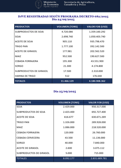 Según la Secretaría de Agricultura de la Nación, durante la cortísima vigencia de la normativa, los días 23 y 24 de septiembre pasado, se concretaron 420 Declaraciones Juradas de Venta al Exterior, DJVE, por un total de 19,5 millones de toneladas con un monto superior a U$S 7.000 millones a valores FOB, es decir, lo que vale en el momento en que la mercadería se sube al buque, y previo a los costos del flete marítimo. El día 24 se aprobaron 11 millones de toneladas por U$S FOB 4 mil millones, mientras que el día 25 fueron 8 millones toneladas y U$S FOB 2,8 mil millones.