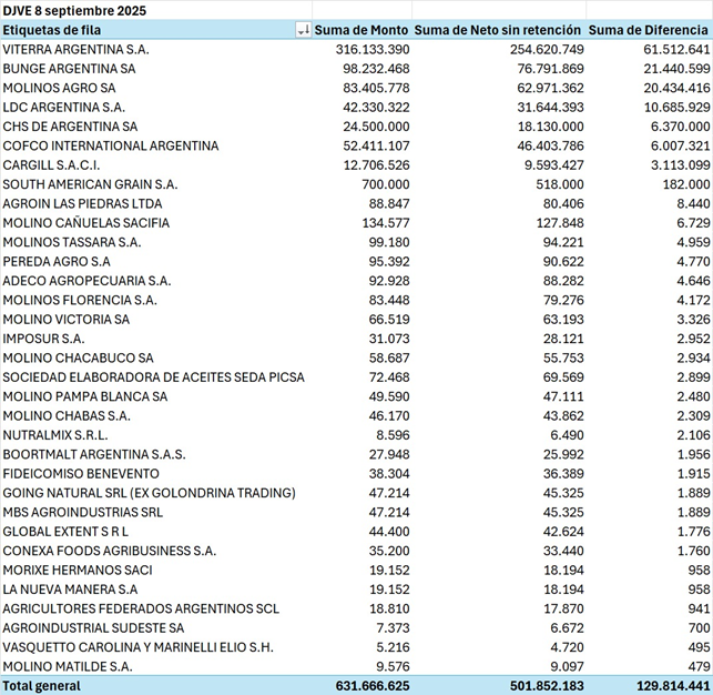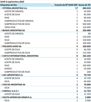 Según indagó StripteasedelPoder.com, el 8 de septiembre de 2025 fueron presentadas un total de 86 declaraciones juradas de venta al exterior (DJVE) por parte de las cerealeras, cuyas principales firmas y productos declarados y toneladas, se exponen a continuación.