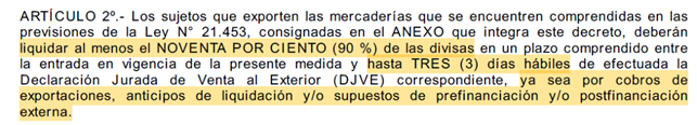 Pero el ingreso neto de dólares y su liquidación para la compra de los granos al productor, no es el precio FOB, ni tampoco el precio FAS, sino como se estipula tortuosamente en el decreto 682, los exportadores ambiguamente solo están obligados a ingresar y liquidar el 90 % de las divisas en el plazo de tres días hábiles de efectuada la DJVE, “ya sea por cobro de exportaciones, anticipos de liquidación y/o supuestos prefinanciación y/o postfinanciación externa”.