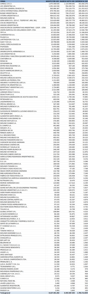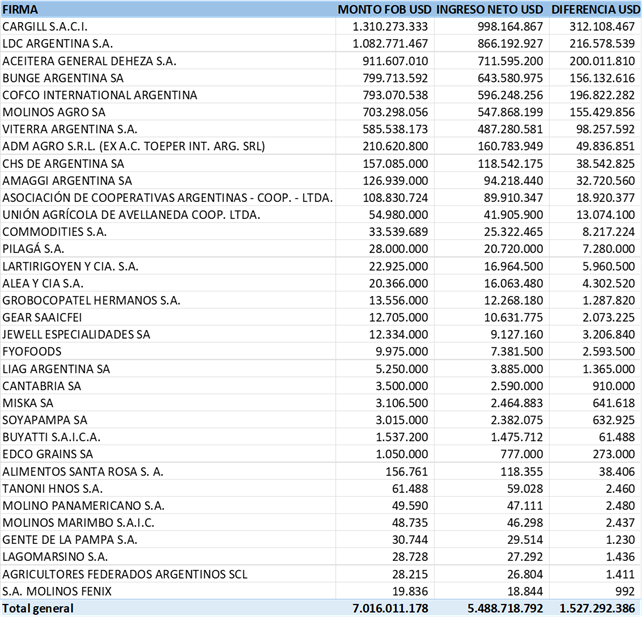 En el siguiente listado se puede ver la lista completa de los beneficiados, y la diferencia que tentativamente concretaron por la eximición de los derechos de exportación. Siendo el monto FOB declarado de 7.016 millones de dólares, a precios internacionales a bordo del buque. Correspondiendo un monto FAS, al costado del buque antes del pago de los derechos de exportación o retenciones, de 5.488 millones de dólares.