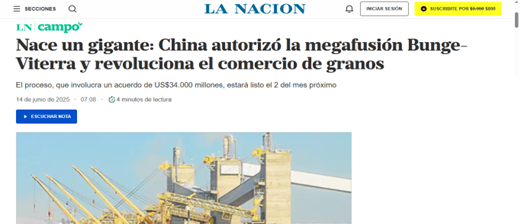 La noticia había sido confirmada a mediados de junio pasado por la agencia de noticias Reuters, y que se puso en marcha al mes siguiente. Tras que Bunge obtuvo el permiso por parte de la República Popular de China, cuyo estado interviene activamente en sus mercados, para permitir esta fusión, con una valuación accionaria de 34 mil millones de dólares. De hecho, cuando se entra a la página web oficial de Viterra, detallan que ahora pasan a llamarse Bunge.