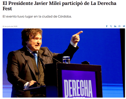 Mientras que el viernes 26, Juez y Roca recorrieron la “ExpoBell 2025” organizada por la Sociedad Rural de Bell Ville. Nicolás Pino, presidente de la Sociedad Rural Argentina (SRA) habló con los representantes mileístas y les expresó su disconformidad por la bluff de las Retenciones Cero que benefició a un puñado de exportadores.
