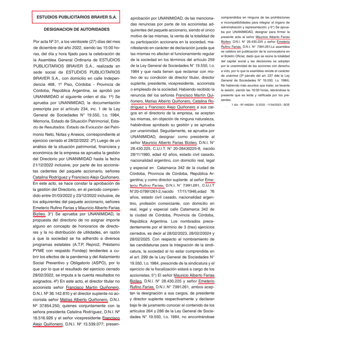 Y todo siguió así, hasta que el 27 diciembre del 2022, la famiglia Farías, de estrechos vínculos con el cordobesismo, le compró a Francisco Quiñonero y Catalina Rodríguez, herederos de Don Arón Braver, la empresa Estudios Publicitarios Braver S.A. De esta manera, Los Farias se quedaron con todos los negocios de esa firma. Entre estos el millonario y monopólico negocio de la publicidad callejera y el mobiliario urbano con un contrato vencido hacía dos años.