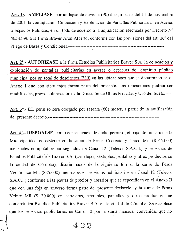 A cambio de esta concesión por los 230 carapantallas, según el decreto 432/02 firmado por Kammerath, la municipalidad de Córdoba iba recibir, como contraprestación, un canon en “intercambio publicitario” de 45.000 dólares mensuales. Que Braver SA, igual que MECA SAIC tampoco cumplió. En detalles, este consistía en 25 mil dólares en “servicios publicitarios” en Canal 12 de Clarín, del cual Braver, había sido dueño; y 20 mil dólares en “cartelería”, “séxtuples” y “pantallas”.