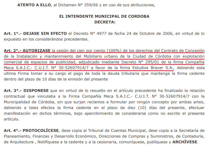 Párrafos siguientes, confirmó que por ese contrato vencido, Estudios Publicitarios Braver SA desistía de todo tipo de reclamo. Cuando todo el mundo sabía, que no solo la municipalidad no le debía absolutamente nada a la empresa. Sino que por contrario, era la empresa la que le debía al municipio, por el mobiliario en paradas, bebederos, rampas para discapacitados, nunca hechos o reparados; más los 3 años de explotación sin contrato, y sin contraprestaciones para los vecinos; más la famosa garantía original de MECA SAIC de un millón de dólares jamás formalizada.