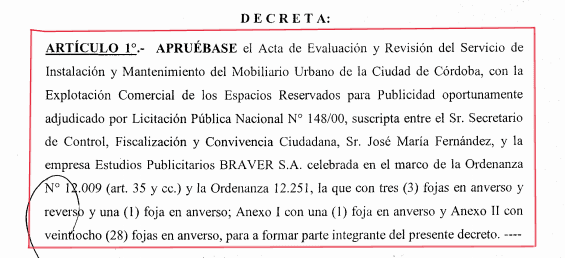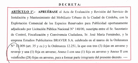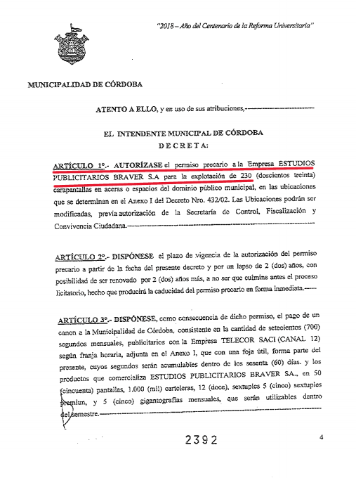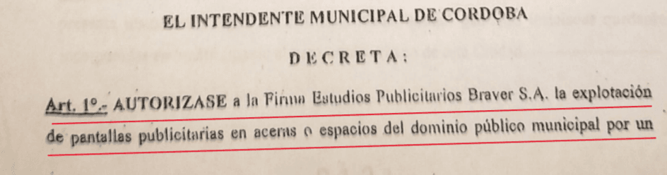 En el decreto, el intendente radical, nuevamente fingiendo transparencia, expresamente dice que debe hacerse una licitación pública para esta concesión ya finalizada. Pero luego, contradiciéndose a sí mismo, decide darle la misma, por dos años, más dos de prórroga, -cuatro en total- con un “permiso precario”, y sin autorización del Concejo Deliberante, a Estudios Publicitarios Braver SA.