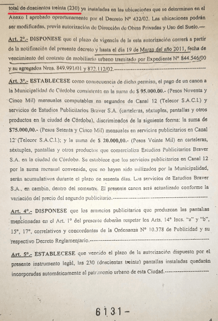 A cambio de esta prórroga, en su decreto, Giacomino acordó un canon mensual de 700 segundos de publicidad en Canal 12, 50 pantallas, 1.000 carteleras, 12 séxtuplas, y 5 gigantografías que tampoco nadie sabe cuándo y como se pagó.