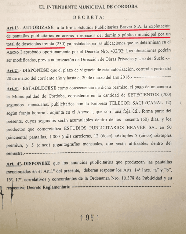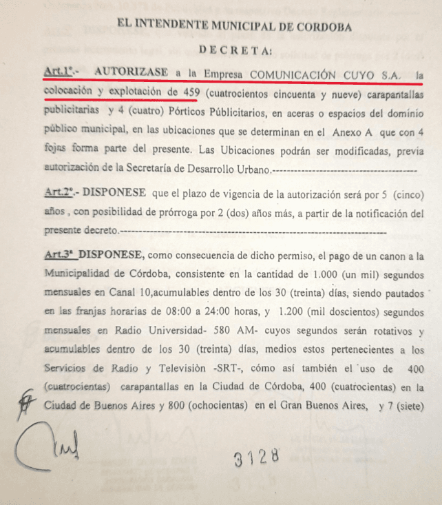 Pero los tongos del intendente Giacomino con la publicidad callejera no acabaron allí. El 30 de junio del 2011, tres meses después de esta nueva prórroga a favor de Braver SA, el “soldado de Cristina” firmó el decreto 3128/11, con el cual, sin licitación, autorizó a la empresa Cuyo Comunicaciones SA de Víctor Moya, vinculada al exsecretario de medios de Néstor y Cristina Kirchner, José “Pepe” Albistur, a instalar 456 carapantallas más en la ciudad de Córdoba.