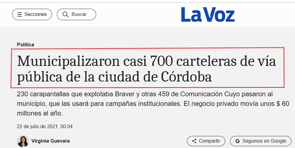 Vino la pandemia y dos años después, en el 2021, de cara a las elecciones legislativas, sorpresivamente Llaryora anunció que la municipalidad iba a recuperar las 700 carapantallas que estaban en manos de la empresa Estudios Publicitarios Braver (230) y Cuyo Comunicaciones S.A. de Albistur – Moya (456).