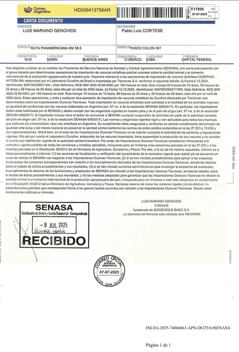 Resulta que en noviembre de 2024, Tecnovax solicitó la importación de un lote de vacunas antiaftosa del laboratorio brasileño Ourofino (con quien tenía un contrato hacía tiempo) en carácter de lote piloto, para poder avanzar con las pruebas exigidas por el SENASA, y sin fines de comercialización.