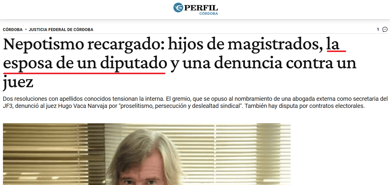 La punta comienza con lo que publicó el diario Perfil, donde hizo un relevamiento de casos de nepotismo en los tribunales federales de Córdoba. No solo se ratificó lo que décadas atrás se llamó la “Sagrada Familia”, es decir: jueces y fiscales repartiendo cargos a sus allegados y socios. Así lo adelantó uno de sus títulos, donde en ese “Nepotismo recargado” está incluida la “esposa de un diputado”.