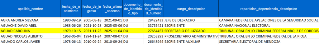 Se trata de Carolina Aguad, hija del llamado “el Milico”, Oscar Aguad. Quien había ingresado a los Tribunales Orales Federal N° 2 en noviembre de 2021, gracias a los oficios de la jueza amiga de su padre María Noel Costa. Cumpliendo este año cuatro años de antigüedad. Sin embargo, tras ser ascendida a jefa de Despacho, saltando el puesto de prosecretaria, fue recientemente promovida al de secretaria.