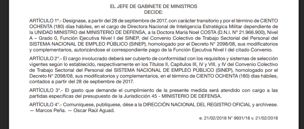 Para finales de 2017, cuando dejó el cargo de ministro de Comunicaciones y pasó al de Defensa, Oscar Aguad la designó al frente de la Dirección Nacional de Inteligencia Estratégica del Ministerio (DNIEM). Resulta un tanto escabroso que ese cargo público sea homólogo a la que ocupó el “Tucán” Yanicelli, represor y torturador de la D2 en Córdoba, décadas atrás, por parte de quien fue secretario de Gobierno provincial en ese entonces, como si se tratara de un irónico bucle.