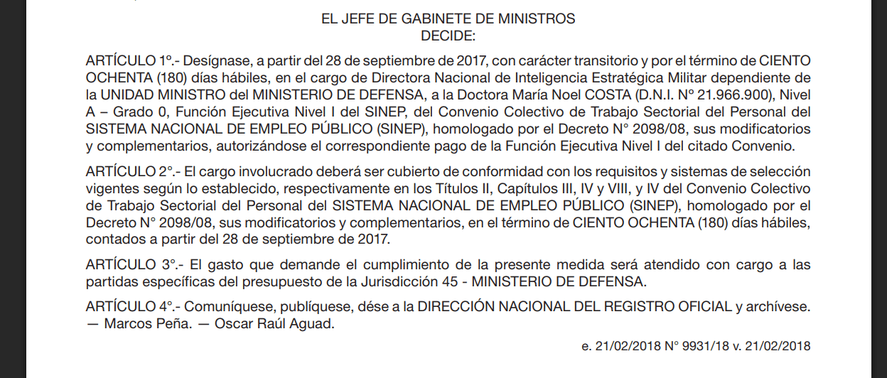 La designación de Costa se formalizó mediante la Decisión Administrativa 143, que contó con la firma del jefe de gabinete, Marcos Peña, y del ministro Aguad, para un plazo de 180 días, aunque luego tuvo una prórroga por otra misma extensión. Pocos días antes, De Loredo había anunciado su renuncia como titular del ARSAT, teniendo asegurado en un futuro cercano un jugoso cargo para su esposa, hija de uno de los firmantes.