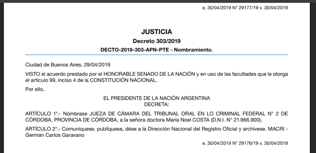 En el medio, Costa dejó la Inteligencia militar en abril de 2019, para asumir al mes siguiente como jueza del Tribunal Oral Federal N° 2 de Córdoba, que se formalizó mediante el Decreto 303/2019. Eran tiempos donde el proyecto político de Cambiemos, estaba trastabillando por la recesión económica y no descartaba que pudiera recibir un fuerte golpe electoral, que precisamente fue lo que ocurrió con las presidenciales de ese año.