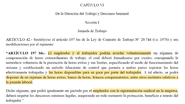 La reforma pretendida implica, también, una verdadera sobrecarga laboral para algunos, a los que no se les pagará horas extras, -como actualmente se cobran, con más al 50% en días de semana y al 100% los fines de semana y feriados-. Ahora, se busca que las horas trabajadas extras integren un “Banco de Horas”, que se devolverán a criterio de la patronal. En función de lo cual, también el anteproyecto suprime la obligación de colocar avisos claros en lugares visibles sobre el inicio y fin de la jornada, (ver arts. 42, 43 y 194 del proyecto).