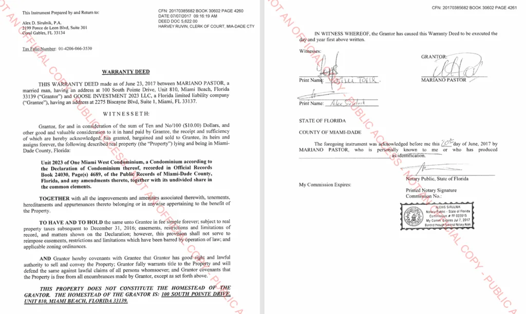En el mismo esquema aparece Goose Investment 2709 LLC, también constituida el 5 de junio de 2017, con idéntico domicilio, agente y manager. El 23 de junio de 2017 compró la unidad 2709 del edificio 50 Biscayne, valuada en 262 mil dólares, y la vendió el 16 de noviembre de 2021. En este caso, firmaron como miembros autorizados Cristian Auguadra y Miguel Ángel Pires, empresario y exrepresentante del futbolista Juan Sebastián “La Brujita” Verón.