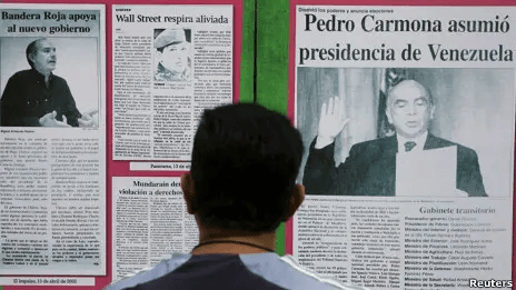 Machado fue nada menos que una de las 400 firmantes del decreto conocido como el Carmonazo, con el que se intentó en el 2002 derrocar al presidente venezolano Hugo Chávez. El que ya antes de perpetrarse, tenía el reconocimiento de EEUU y un crédito concedido por el FMI. Pero el tiro salió por la culata, porque en términos democráticos lo reafirmo aún más en el poder. Y la taimada explicación que dio Machado, que creía que se trataba de un libro de visitas y no de un decretazo, revela la irresponsabilidad con se conduce en relación sus actos.
