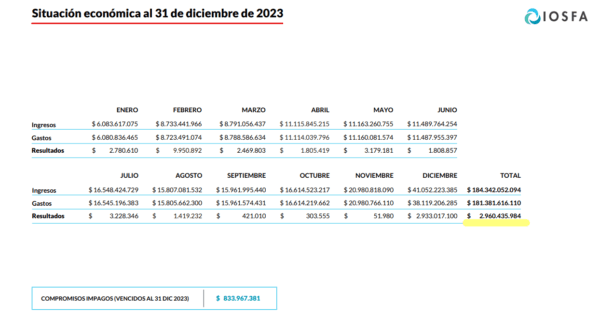 Según se observa en el balance oficial de IOSFA, al 31 de diciembre de 2023 mostraba un resultado positivo de $2.960.435.984, un dato consistente con la memoria del ejercicio económico de ese año, que indica un incremento del patrimonio neto en moneda homogénea de $13.037 millones, pasando de $19.223 millones en 2022 a $32.260 millones en 2023. Lo que no se explica es qué provocó el deterioro económico de la obra social.