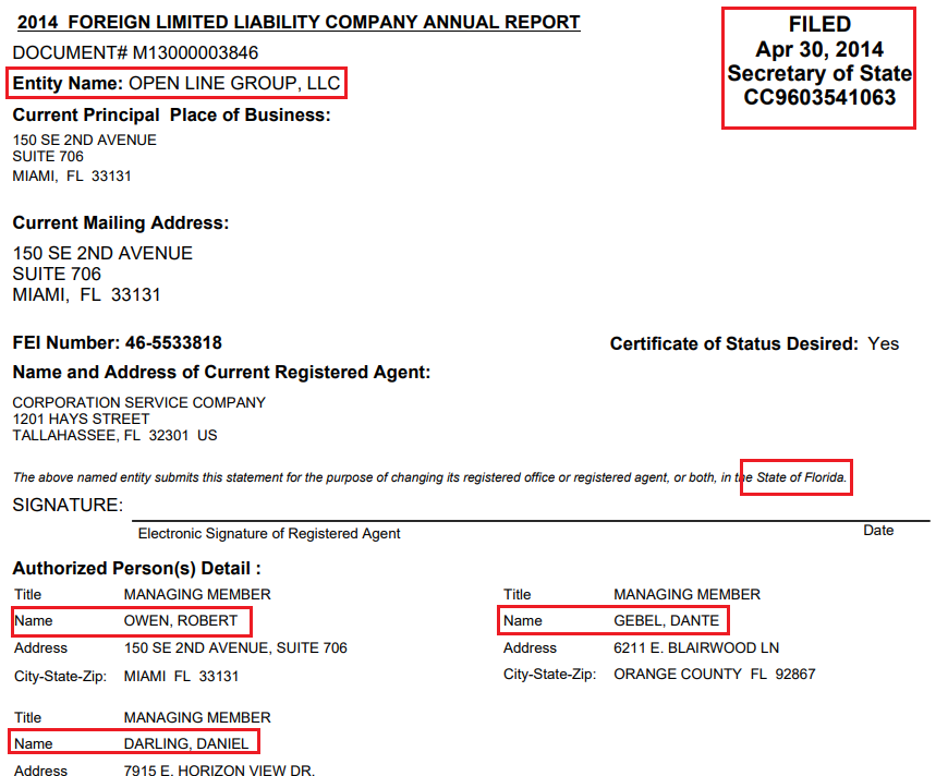 Estas sospechas se ven agravadas por la brevísima existencia de OPEN LINE LLC, que operó apenas dos años y medio y fue dada de baja el 26 de febrero de 2016. Su revocación de su autorización para operar no respondió a una decisión voluntaria. Sino que la hizo el gobierno de Flroida  debido a incumplimientos graves y elementales, dado que la empresa de Gebel y Darlin jamás presentó los reportes anuales obligatorios ante el Departamento de Estado de Florida, quedando formalmente catalogada como revoked for annual report” (revocado por  el informe anual).