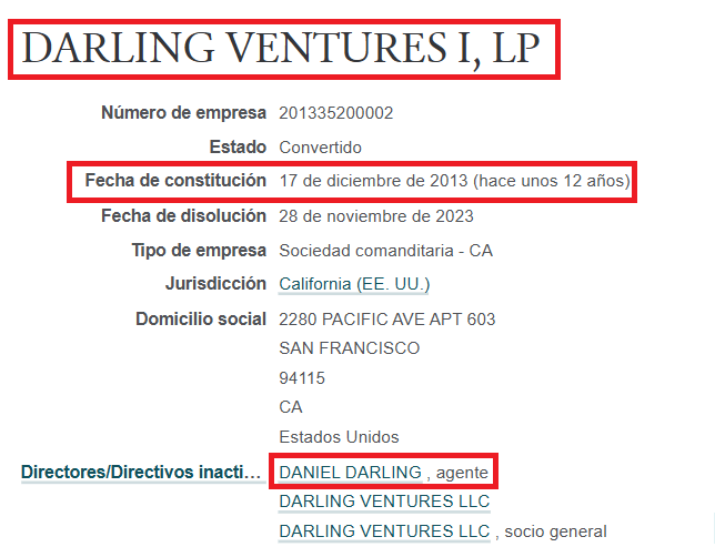Seis meses después de registrar OPEN LINE LLC, el 17 de diciembre de 2013, Daniel Darling —Pastor Ejecutivo del pastor Gebel y padrino del sindicalista Juan Pablo Brey- constituyó en California la sociedad en comandita DARLING VENTURES I, LP. Según los registros oficiales, la firma tuvo como único socio a Darling, el CEO o Pastor Ejecutivo de Gebel, y permaneció activa como tal hasta el 28 de noviembre de 2023, fecha que se fusionó con otra compañía que se desconoce su nombre.