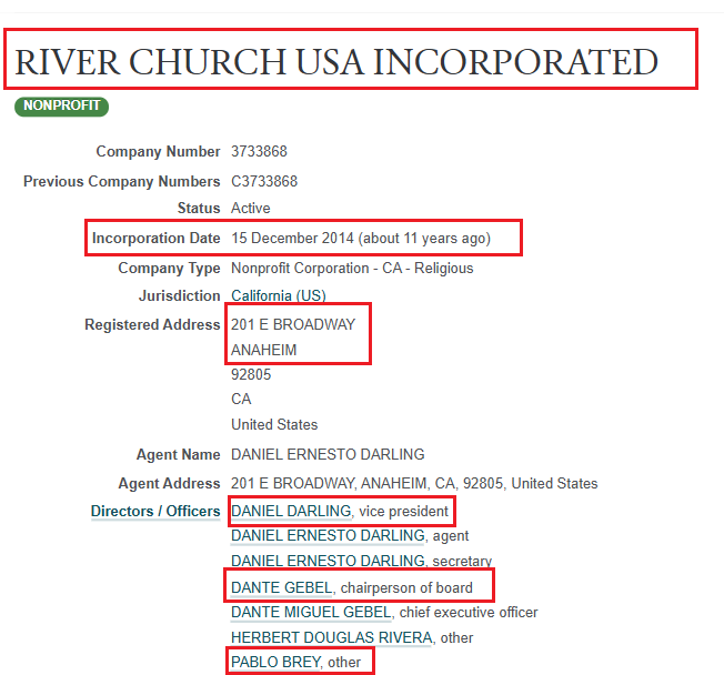 La figura legal bajo la cual opera esta iglesia que dirige Gebel es la sociedad RIVER CHURCH USA INCORPORATED (Iglesia del Río Estados Unidos de Norteamérica). Fue inscripta el 15 de diciembre de 2014 nuevamente como “nonprofit corporation” -corporación sin fines de lucro- bajo el número 3733868. Su domicilio legal es en la calle Broadway 201, Anaheim, California donde funcionan la sede religiosa, mediática e institucional del pastor que lo catapultó al mundo. Como se dijo, esta fundación se fusionó con la primera de Gebel, FAVORDAY creada en el 2008.